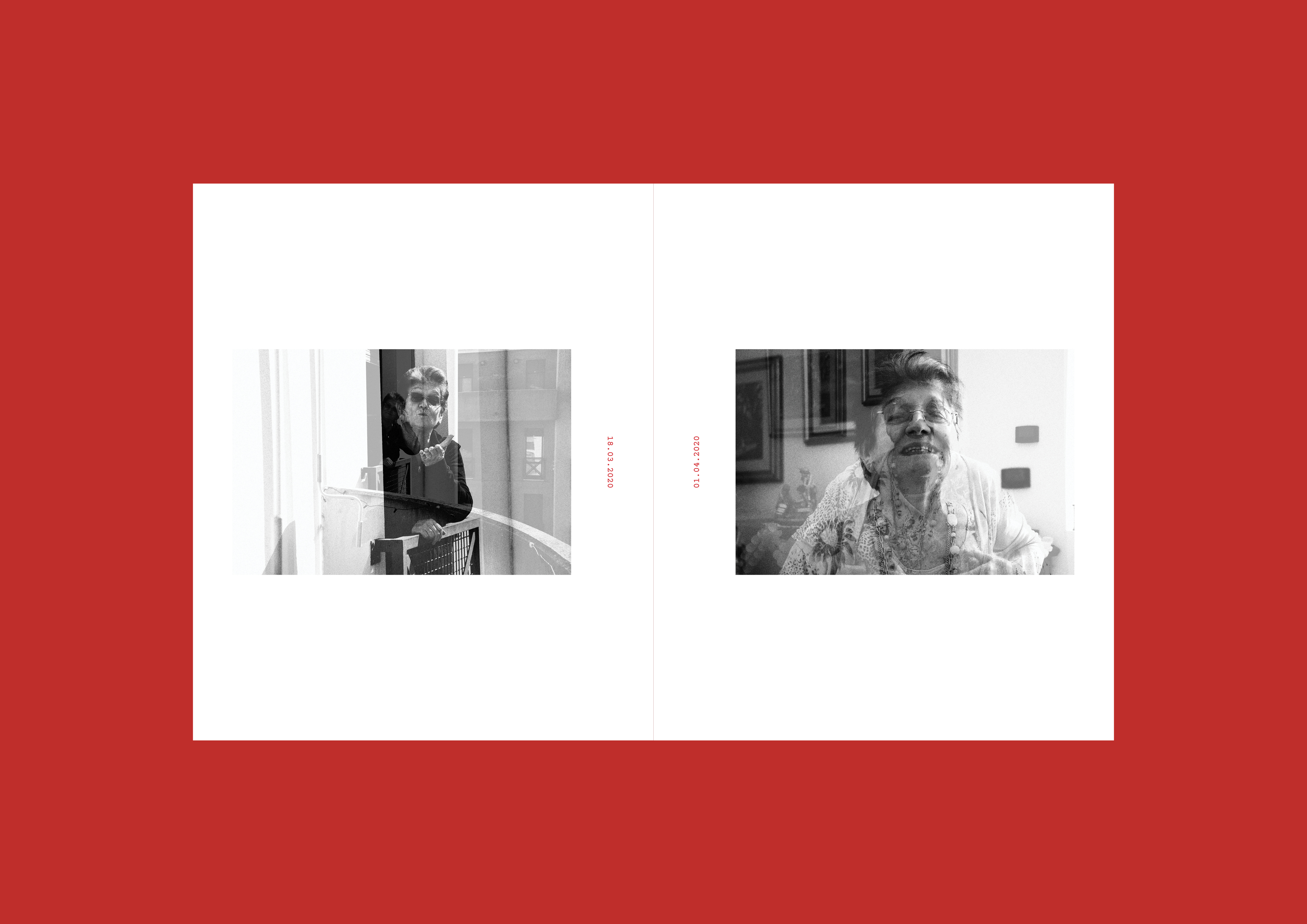 I captured moments spent with my grandma during this first quarantine through photography, which are then presented in chronological order within a 8 pages publication. The use of layered images for each individual photograph allows these to gain a sense of motion to represent the passing of time, either slow or fast depending on how the viewer wants to perceive it, and create a feeling of nostalgia.